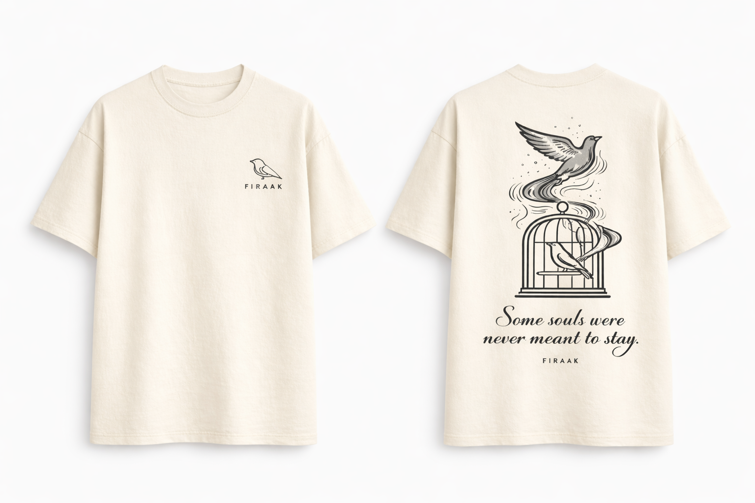A visual story of release and acceptance. Featuring a minimal FIRAAK bird mark on the front and an expressive back artwork symbolizing freedom beyond cages, this oversized tee speaks to those who understand that not everything is meant to last — and that’s okay. Soft, relaxed, and emotionally grounded.
